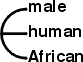 (∃x)(male(x) ∧ human(x) ∧ African(x))With the graph notation, the lines of identity have no names. Therefore, the rules of inference are much simpler because there is no need for equal signs between variables or rules for substituting one variable name for another.
