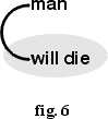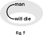 (∃x)(∃y)(∃z)(∃u)(∃v) (man(x) ∧ x=y ∧ y=z ∧ z=u ∧ u=v ∧ willDie(v))Peirce’s method of reading such graphs would produce the sentence "There is a man that is something that is something that is something that is something that will die." To form the equivalent of Figure 6, suppose that the second instance of "is" and everything following it occurs inside the shaded area. The resulting graph would correspond to the following formula: