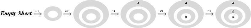 Rule 3i inserts a double negation around the empty graph; another application of Rule 3i inserts another double negation around the previous one; Rule 1i inserts a into the shaded area; Rule 2i iterates a into the innermost area; finally, Rule 1i inserts b into the other shaded area. The theorem to be proved contains five symbols, and each step of the proof inserts one symbol into its proper place in the final result. Frege had eight other axioms, each of which can be proved by Peirce’s rules in a similarly short proof.